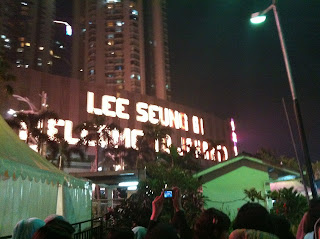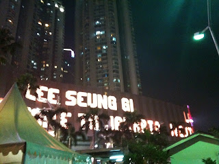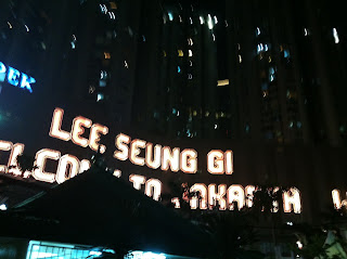 The Fan Meeting itself was held in a built tent in Taman Anggrek Mall (TAM) parking lot. Even though it’s a temporary tent, but it was big and comfortable. The entrance queue was not long, and the verification check was fast. Good job, Munial Sport Group! What I like most is the big moving sign on TAM saying “WELCOME TO JAKARTA, LEE SEUNG GI” and “JKT ❤ LEE SEUNG GI”. The sign was so big that you could see it from across the road.