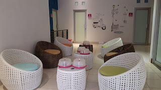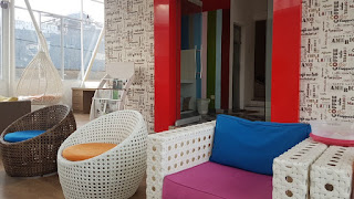 Kamar kami yang terletak di lantai 2 ada jendela nya tapi menghadap ke salah satu ruang tengah guesthouse yang mudah dilihat oleh tamu lain atau staff yang lalu lalang atau nongkrong disana, jadi gorden nya selalu kami tutup. Namanya juga kamar standar yang paling murah. Tapi gapapa, karena kami sampai disana juga udah malam dan checkout besoknya pagi-pagi. Walaupun di dalam kamarnya tidak disediakan pemanas air minum, kopi, teh dan gula tapi semua itu ada di ruangan tengah yang bisa diambil sepuasnya. Konsepnya penginapan rumahan, ada beberapa ruang tengah di lantai 1 dan 2. Ruang santai yang paling dekat dengan kamar kami berisi sofa dan kursi unik warna-warni, ayunan sangkar nge-hits dan instagrammable, pantry dan dapur bisa numpang masak, minjem dan nyuci piring gelas.