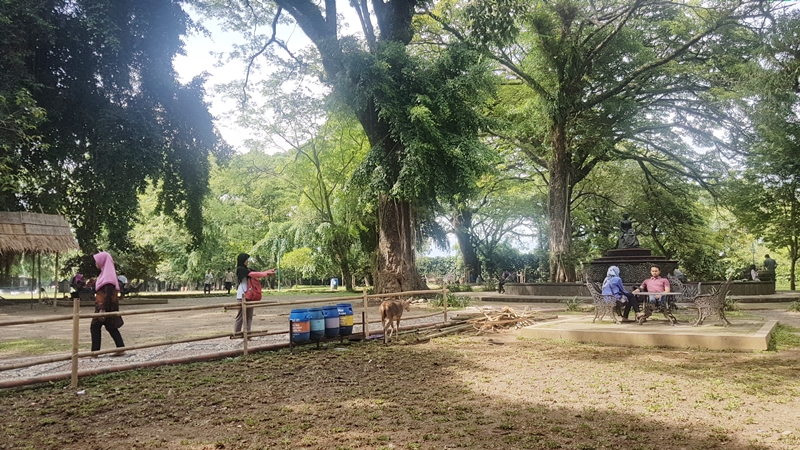 Taman Balekambang bagian Partinah Bosch: ada patung Partinah, tempat duduk, refleksi batu, dan rusa |