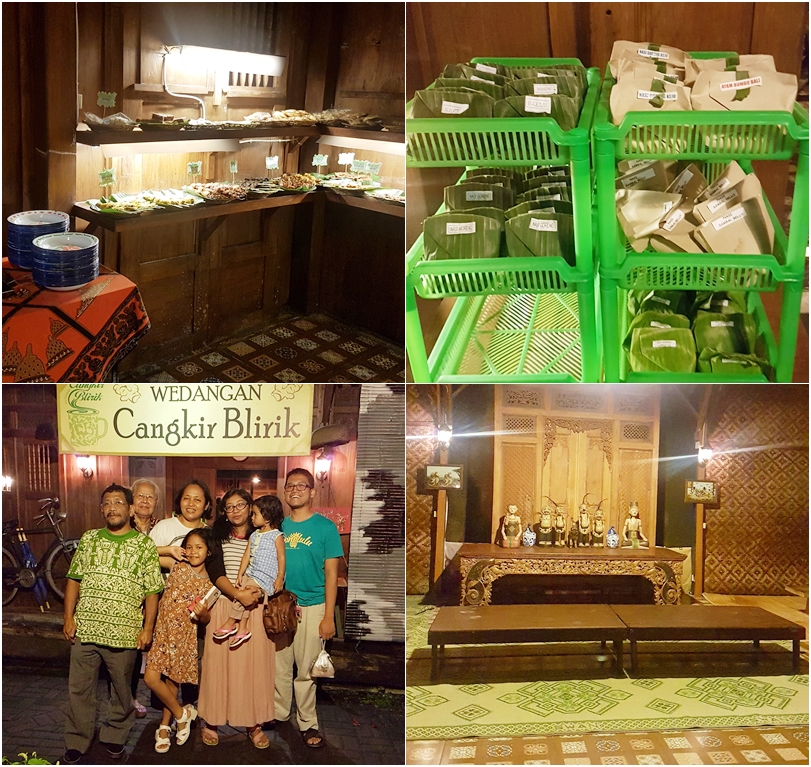 Balik lagi ke hotel, sekitar jam 7.30pm dijemput sama saudara naik mobilnya dia kita menuju ke resto Wedangan Cangkir Blirik. Wedangan atau Hik adalah warung makan angkringan khas Solo yang awalnya hanya berupa gerobak yang mangkal di emperan atau pertigaan dan menjual nasi kucing (nasi bungkus dengan aneka lauk dan gorengan) dan minuman hangat (wedang) yang bukanya selalu malam hari. Sekarang Wedangan sudah lebih modern, tidak hanya gerobak pinggir jalan tapi ada juga restoran dengan tempat duduk bagus dan fasilitas wifi jadi wanita dan anak2 juga nyaman ber-Wedangan. Masuk ke restorannya kami milih-milih dulu lauknya seperti ayam, usus, dendeng dan lain-lain yang ditusuk lidi seperti sate trus apa yang kita pilih akan digoreng di tempat dan disajikan ke kita hangat-hangat. Walaupun di resto bagus, suasananya dibuat semirip Wedangan tradisional yaitu cahaya remang-remang dari lampu teplok, piring dan cangkirnya blirik kuno (makanya disebut Cangkir Blirik ya). Bisa duduk lesehan ataupun di kursi gede landai jaman dulu yang bikin tambah betah berlama-lama ngobrol disana.