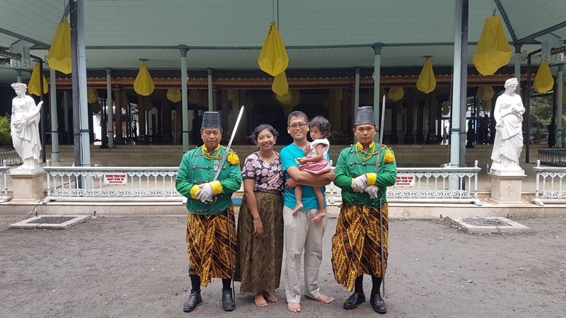 Keesokan harinya setelah sarapan di hotel, kami mulai jalan-jalan di kota Solo dimulai dari Keraton Surakarta Hadiningrat. Kami parkir mobil di parkiran Alun-Alun Utara yang dipadati oleh pedagang batik dan lainnya yang pindah sementara dari Pasar Klewer sebelah Keraton yang terbakar di akhir tahun 2014 yang lalu. Harga tiket masuk nya 10ribu/orang termasuk Museum Keraton di dalamnya. Karena saya waktu itu menggunakan celana pendek, saya diberi kain jarik untuk dililit menutupi kaki sebelum masuk ke bagian dalam Keraton. Selain itu alas kaki juga harus dilepaskan. Wah Nadya seneng banget deh nyeker. Kita bisa berkeliling sendirian atau bersama guide disana yang sudah agak tua dan menggunakan seragam abdi dalem Keraton. Tidak ada harga pasti sewa guide nya berapa tapi yang jelas kita harus ngasih tips di akhir tur. Guide nya juga menawarkan kami foto bersama mbok-mbok pelayan keluarga Raja, dan foto bersama dua penjaga Keraton yang menggunakan seragam security Keraton yang cukup gagah. Kami tidak berfoto dengan simbok2 tapi kami foto dengan ‘security’ Keraton yang memaksa kami memberikan tips. Agak pemerasan tapi ya sudahlah lumayan buat kenang-kenangan.