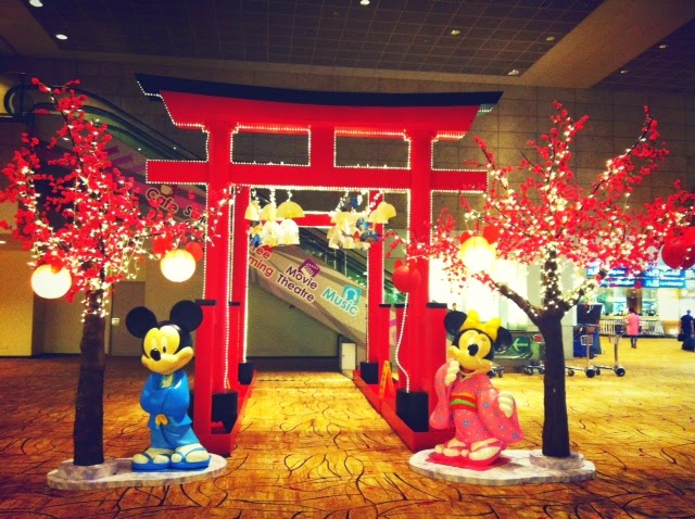 As always, Changi was filled with cute decoration. I saw red house with Chinese language (representing Lunar New Year?), a couple of goats (representing Goat Year and Valentine?), and Japanese gates with Cherry Blossoms (representing Spring is coming?), and beautiful Koi Pond!