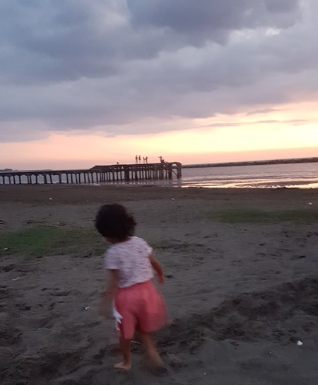 Then we continued our way back to Makassar and arrived in the city around 5.30pm. Still too early for dinner, so I asked the driver to bring us to Akkarena Beach. My plan was to see the sunset, but apparently, Makassar traffic was really jammed on that Saturday evening, therefore we only arrived on that beach at 6.15pm when the sun was already down. There were still few lights creeping in from the sky, thus Nad could enjoy playing with sands for a while. We walked to the small wooden dock and walked really careful because the bridge had many holes here and there.
