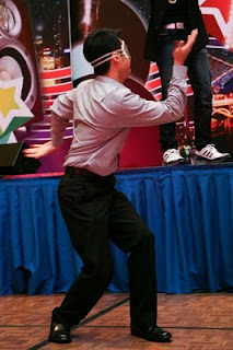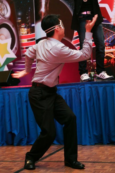 But then something happened, MC called employees who just joined company less than 2 weeks to come upstage. My friends pushed me, so yeah, I went upstage not knowing what would happen to me (actually I hoped I could get some prize). There were about 5 people on stage, our eyes were closed by a cover. DJ was playing some kinds of songs, and we were supposed to dance according to the song: Indian, 80s, Rock, RnB, Dangdut (seriously they played Kopi Dangdut!), Pop, Arabian….. phewww finally the music stopped! MC released my eye-cover and ta da….. I was alone on the stage! Nobody’s around anymore, all people were laughing and clapping their hands looking at me, even the VIP guests (directors) sitting in the fronts were giving me standing ovation. Apparently while we’re dancing, MC released one by one until the best dancer staying alone! This is a picture of one of my rival dancers.