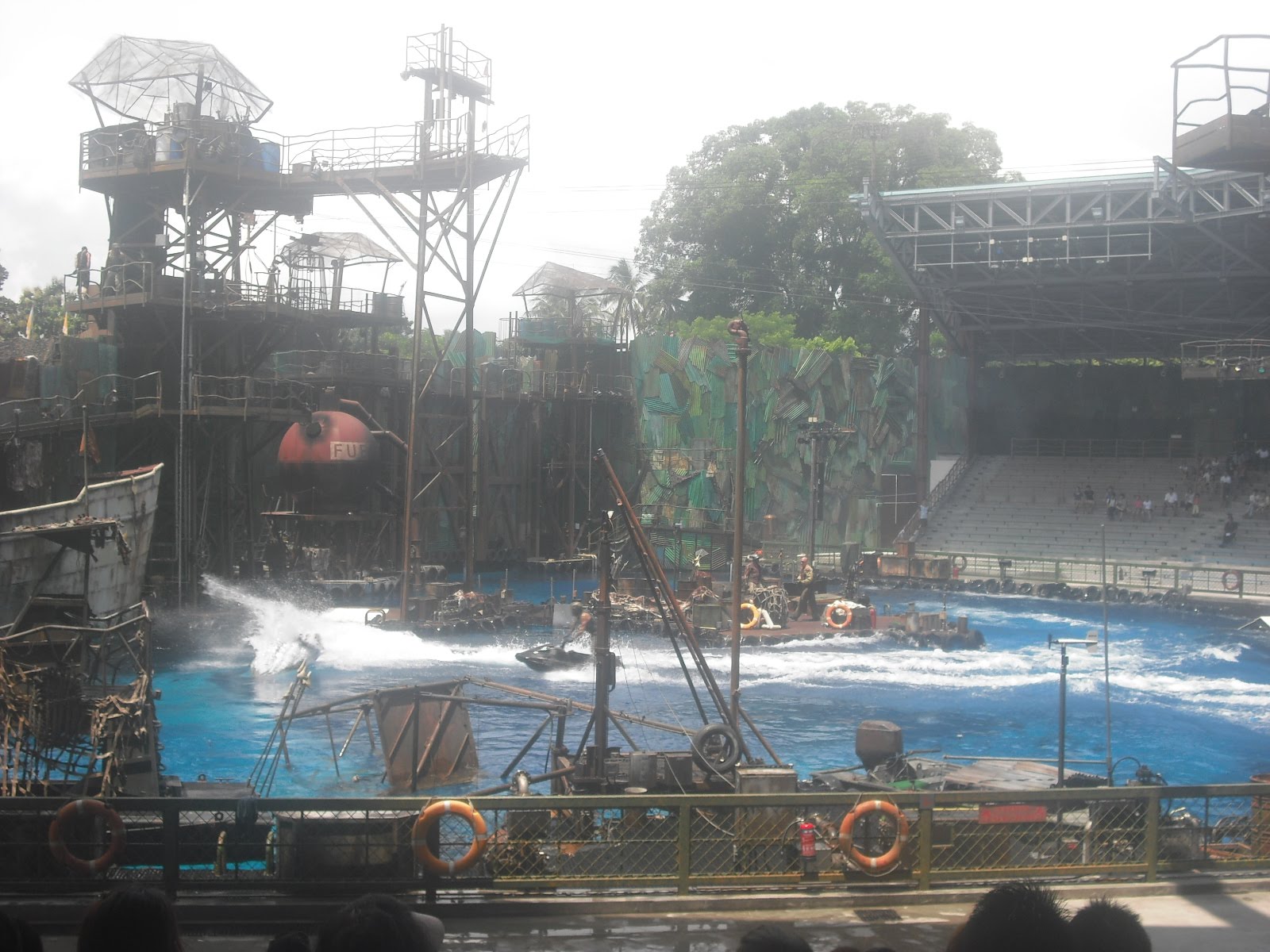 Witness death-defying stunt, awesome explosions and thrills at this sensational ‘live’ water show. It was from Water World movie, starring Kevin Costner (I never watched this movie). There were some people fighting, shooting, and throwing bomb. They were not really shooting at each other but it looked real.