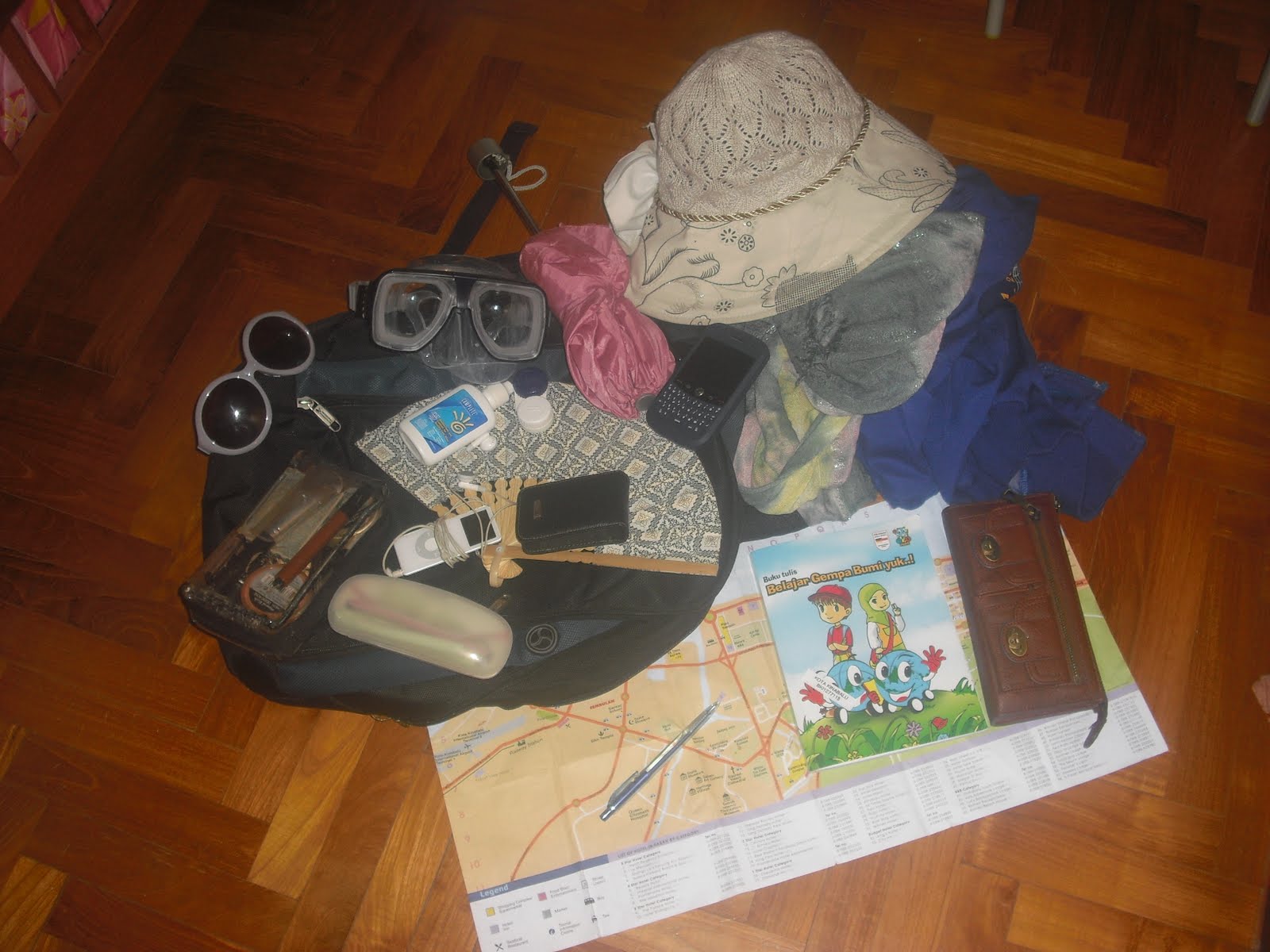 Even though I didn’t bring them all everywhere, like I didn’t bring jacket to the beach and mask to the mountain, but generally they are inside my bag: hat, jacket, shawl, umbrella, blackberry, wallet, notebook (as a book not laptop), pen, map, sunglasses, glasses (my sights are minus 800 and 600), the package of contact lenses, mask (with adjustable lenses)…. oh so much for these eyes! Also my harryPODder (yea I know the iPod is so 1st generation, so what, I like him. Did I just write say HIM?!), pocket camera (thank God I am not into photography), hand fan, sunblock, make-up kit, and usually some snacks plus a bottle of mineral water. In some countries, well okay, Malaysia, you would prefer to leave your passport at hotel, and take really care your bag on the street. (I think it’s applied also for Indonesia, but I wouldn’t say it because it IS my country…. but I just wrote said it!).