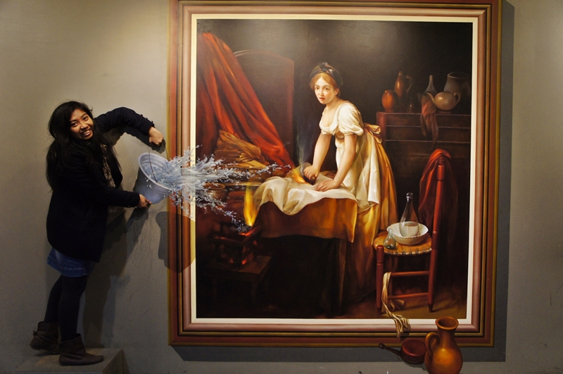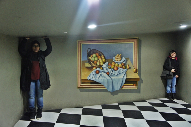 It was difficult to spot Trick Art Museum entrance in the midst of Hongdae crowds. From Exit #9 of Hongdae Station (Subway Line 2), walk straight for 200 meters towards the Starbucks coffee shop. The entrance was quite small, and it went down to the basement. The whole area was not too big but packed with funny trick paintings. This place also had a gallery and a cafe which are themed in Greek.