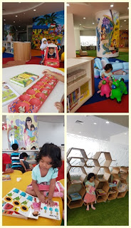 Dari Lantai 2 ada eskalator tapi hanya sampai Lantai 4. Kami naik eskalator sampai Lantai 4, sambil melihat-lihat, baru lanjut naik lift. Di Lantai 4 ada foodcourt tapi stall-stall nya masih pada kosong. Kami kemudian naik lift menuju Lantai 7 tujuan utama kami, yaitu playground dan buku anak-anak. Nad seneng banget menjelajahi semua sudut ruangan, milih dan lihat-lihat bukunya walaupun cuma sebentar karena ter-distract dengan mainan-mainan. Ada perosotan, rumah-rumahan, kolam bola, lego blocks dan lain-lain. Ada mobil-mobilan juga tapi sayang cuma 2 buah, dipakai terus dan banyak anak yang pengen naik juga (termasuk Nad). Selain itu saya seneng banget ngeliat ada mainan tradisional congklak. Walaupun Nad belum tau cara mainnya, dia asik aja mindah-mindahin keong nya dari satu lubang ke lubang lain hehe. Tempatnya nyaman banget full carpet. Buku-bukunya sendiri beragam ada yang bahasa Indonesia dan bahasa Inggris, dan tentunya masih baru-baru.