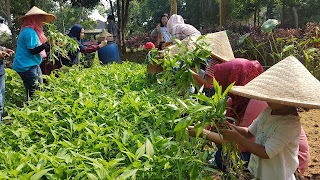 Sekitar jam 8 acara dibuka dengan senam bersama, lalu anak-anak dibagi ke beberapa kelompok berdasarkan usianya. Nad dan anak umur 3-4 tahun lainnya masuk ke dalam kelompok Sepakbola (nama grup nya disesuaikan dengan tema). Kebayang ga gimana bingung nya kakak pembina grup ini, anak-anaknya belum terlalu interaktif dan harus dipandu sama orangtuanya hehe. Aktivitas pertama untuk grup Sepakbola adalah memetik sayur. Tiap anak dipinjamkan topi caping ala petani untuk dipakai, lalu berbaris di depan kebun kangkung. Kakak pembina mencontohkan cara memetik kangkung dengan menariknya dari tanah, lalu anak-anak balita ini mulai memetik dalam rentang waktu tertentu. Setelah waktu habis, kangkung di tangan mereka dibawa ke ember-ember berisi air yang sudah disiapkan untuk dibersihkan, lalu dimasukkan ke kantong plastik yang baru dibagikan, dan sayurnya boleh dibawa pulang. Yahh nak, mestinya tadi petik yang buanyakkkk hehe.