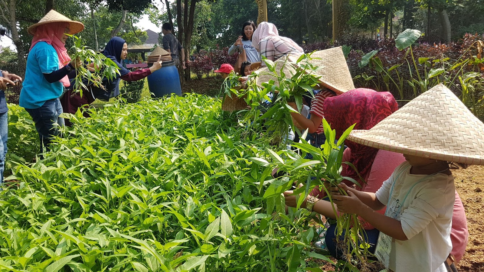 Sekitar jam 8 acara dibuka dengan senam bersama, lalu anak-anak dibagi ke beberapa kelompok berdasarkan usianya. Nad dan anak umur 3-4 tahun lainnya masuk ke dalam kelompok Sepakbola (nama grup nya disesuaikan dengan tema). Kebayang ga gimana bingung nya kakak pembina grup ini, anak-anaknya belum terlalu interaktif dan harus dipandu sama orangtuanya hehe. Aktivitas pertama untuk grup Sepakbola adalah memetik sayur. Tiap anak dipinjamkan topi caping ala petani untuk dipakai, lalu berbaris di depan kebun kangkung. Kakak pembina mencontohkan cara memetik kangkung dengan menariknya dari tanah, lalu anak-anak balita ini mulai memetik dalam rentang waktu tertentu. Setelah waktu habis, kangkung di tangan mereka dibawa ke ember-ember berisi air yang sudah disiapkan untuk dibersihkan, lalu dimasukkan ke kantong plastik yang baru dibagikan, dan sayurnya boleh dibawa pulang. Yahh nak, mestinya tadi petik yang buanyakkkk hehe.