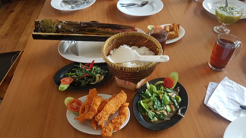 Rumah makan berlantai dua ini menyediakan meja dengan kursi dan meja lesehan. Meja lesehannya ada lubang untuk menjatuhkan kaki ke bawah, jadi tidak harus duduk dengan kaki melipat. Ini penting ya buat yang kakinya sering kesemutan seperti saya hehe. Meja lesehan selalu lebih menyenangkan buat anak-anak karena mereka bisa bergerak bebas kesana kemari (tanpa harus dikejar-kejar) dan tidak perlu diam duduk di kursi saja. Menu spesial yang paling enak dan sering dicari di restoran ini adalah Ikan Patin Bakar Dalam bambu, yummm!